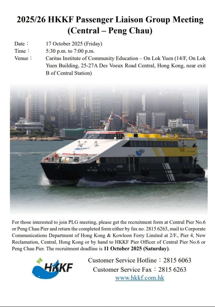 HKKF Passenger Liaison Group Meeting (Central – Peng Chau) will be held on 17 October 2025 (Friday). For details of PLG meeting and member recruitment, please refer to the posters at Central Pier No.6 and Peng Chau Pier. The recruitment deadline is 11 October 2025 (Saturday).