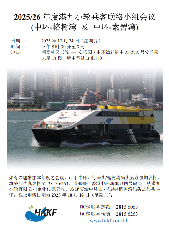 2025/26年度港九小轮乘客联络小组会议 (中环-榕树湾 及 中环-索罟湾) 港九小轮(中环-榕树湾 及 中环-索罟湾)乘客联络小组会议将于2025年10月24日(星期五)举行,会议详情及参加办法可参阅于中环六号码头及坪洲码头张贴的宣传海报,截止申请日期为2025年10月18日(星期六)。
