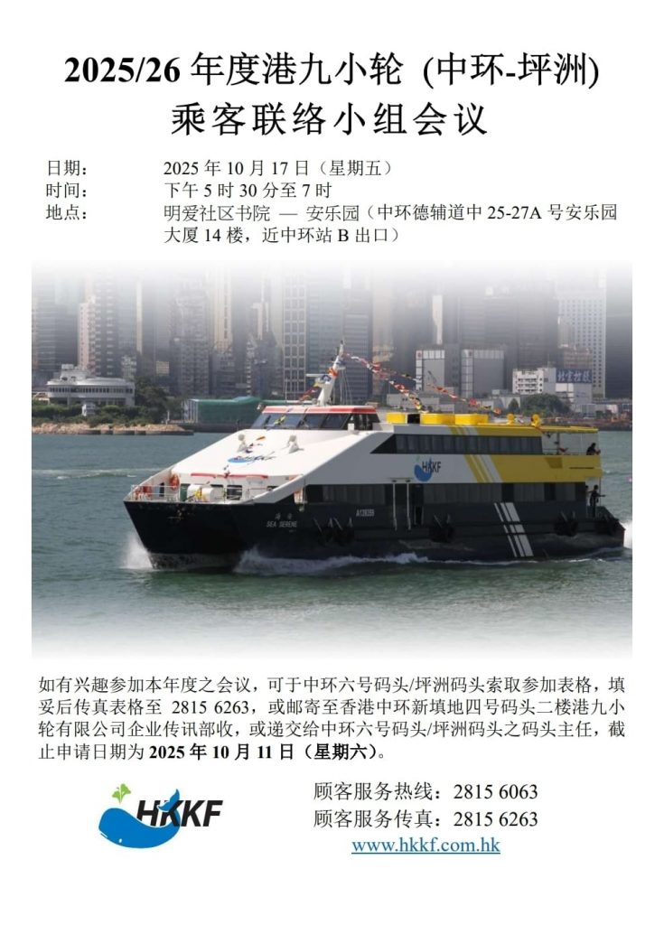港九小轮(中环-坪洲)乘客联络小组会议将于2025年10月17日(星期五)举行,会议详情及参加办法可参阅于中环六号码头及坪洲码头张贴的宣传海报,截止申请日期为2025年10月11日(星期六)。